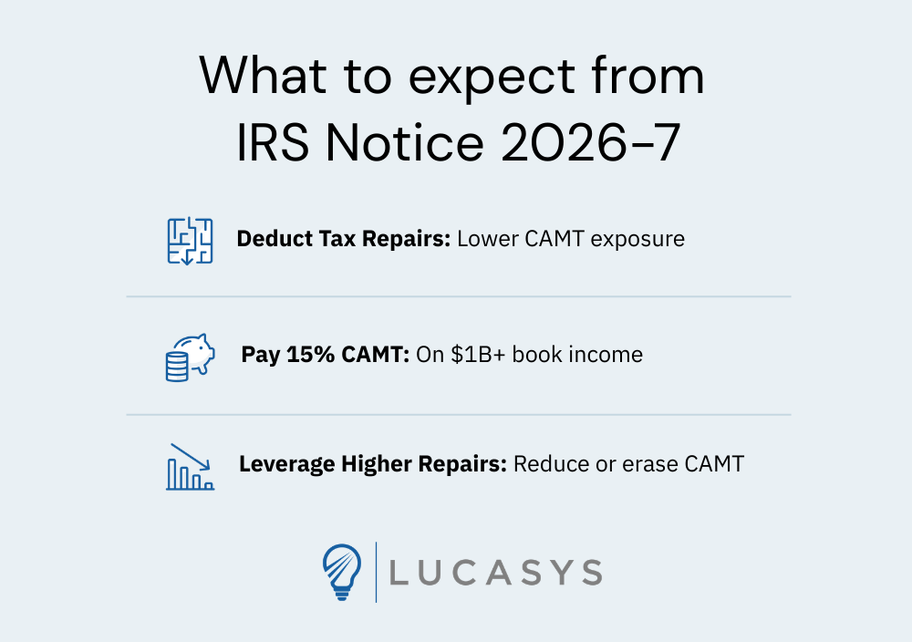 For more details, refer to the official IRS Notice here. To schedule a Tax Repairs discussion with a trusted Lucasys expert, book a meeting here.